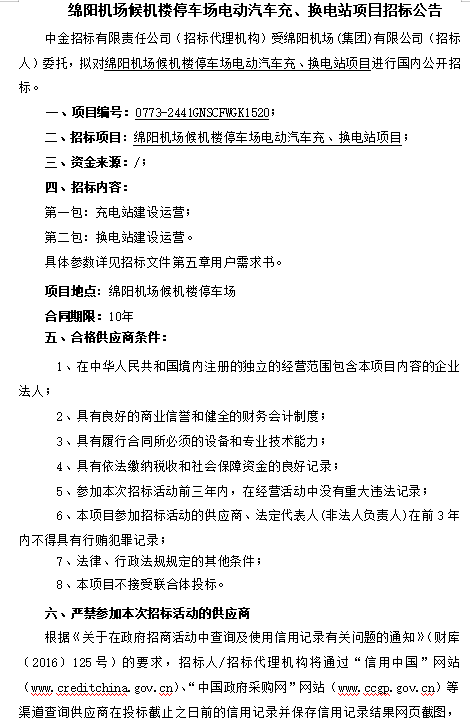 綿陽機場候機樓停車場電動汽車充、換電站項目招標公告