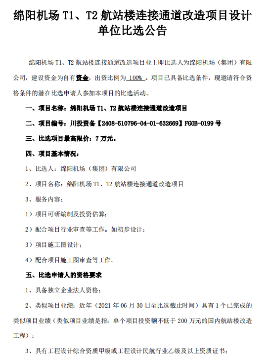 綿陽機(jī)場(chǎng) T1、T2 航站樓連接通道改造項(xiàng)目設(shè)計(jì)單位比選公告
