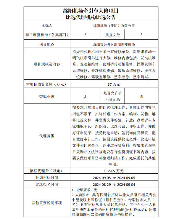 綿陽機場牽引車大修項目比選代理機構比選公告